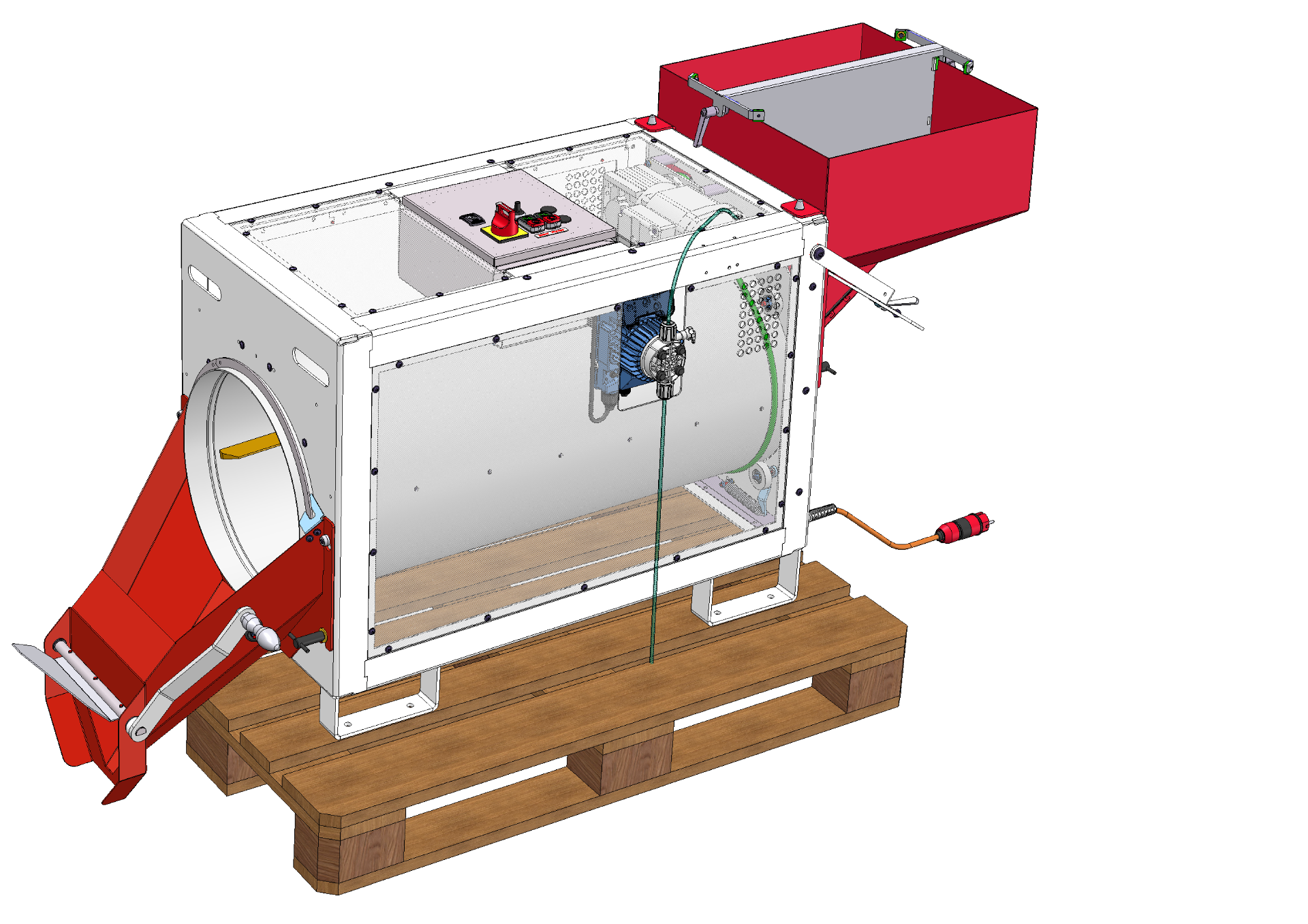 Die Saatgut-Behandlungstrommel BT100 wird zur Beimpfung von unterschiedlichen Saaten mit Nährstoff- und Bakterienlösungen verwendet, die im ökologischen und konventionellen Landbau zugelassen sind. Das behandelbare Artenspektrum umfaßt z.B. Raps-, Gras-, Getreide-, Mais-, Bohnen-, Kräutersaaten und vieles mehr. Während der Beimpfung des Saatgutes in der Behandlungstrommel erfolgt die Umwälzung schonend im freien Fall unter sehr geringer mechanischer Belastung. Die regelbare Trommeldrehzahl in Verbindung mit der einstellbaren Dosierpumpe, sowie die Möglichkeit die Durchsatzmenge des Saatgutes mittels Schieber im Einfülltrichter zu bestimmen, erlauben eine angepaßte und gleichmäßige Benetzung des Saatgutes mit der Nährstoff- oder Bakterienlösung. Durch den Einbau eines Füllstandssensors im Einfülltrichter wird zuerst die Dosierpumpe und nach 2 Minuten die Trommel automatisch abgeschalten, wenn der Trichter leer ist. Der Abfülltrichter hat eine mechanische Sperrklappe mit Hebel zum Puffern des Saatgutes beim Wechsel der Auffangsäcke z.B. bei Raps, Mais und anderen Kleingebinden. Das Gestell sowie die Ein- und Abfülltrichter bestehen aus Stahlblech und sind pulverlackiert. Die Behandlungstrommel und sonstige Teile, die mit der Behandungslösung in Kontakt kommen können, sind aus rostfreiem Stahl bzw. aus Kunststoff gefertigt.